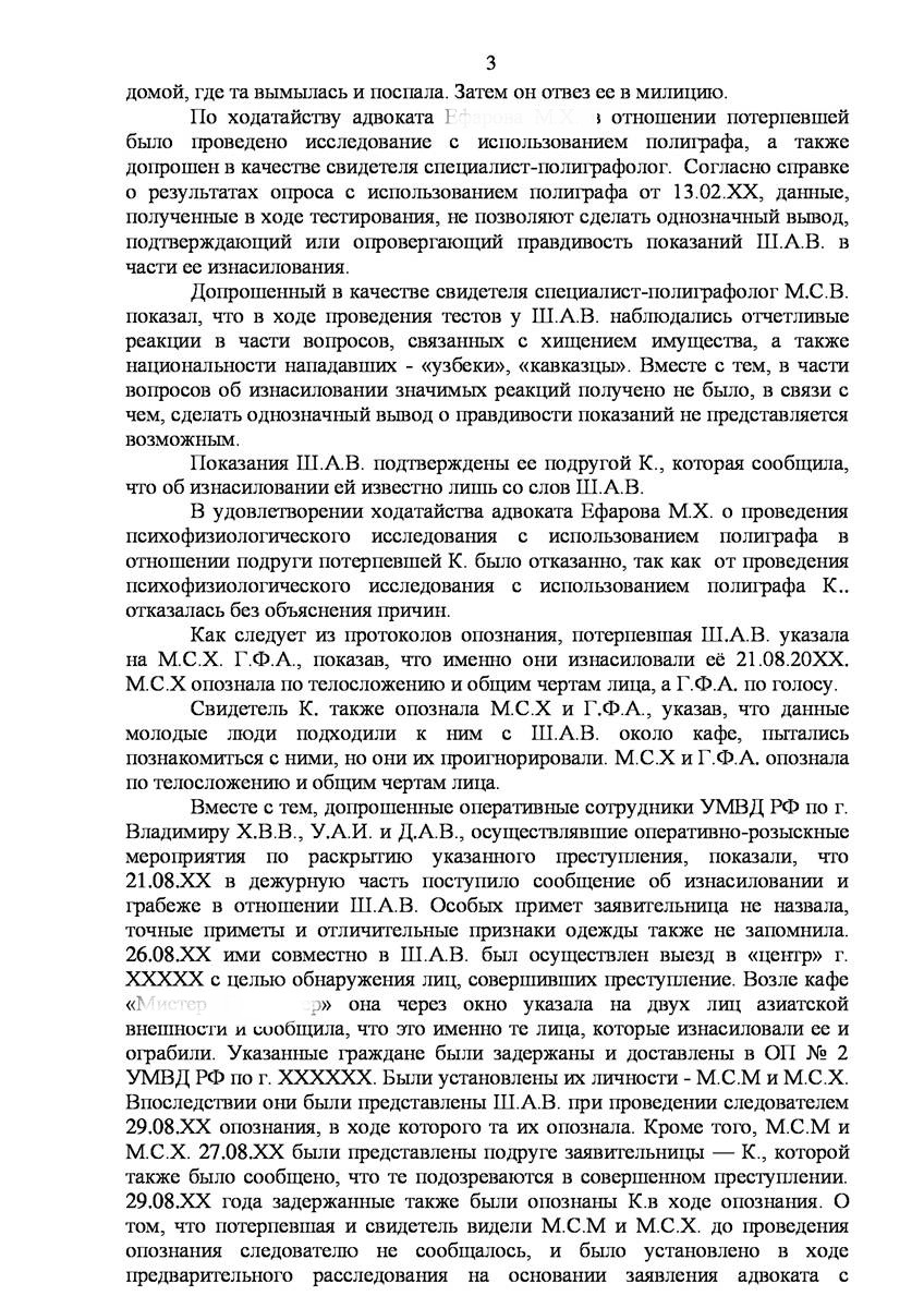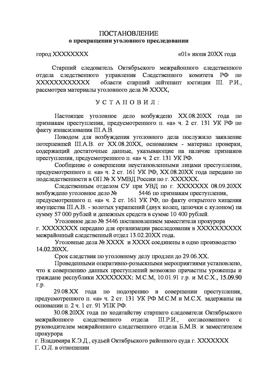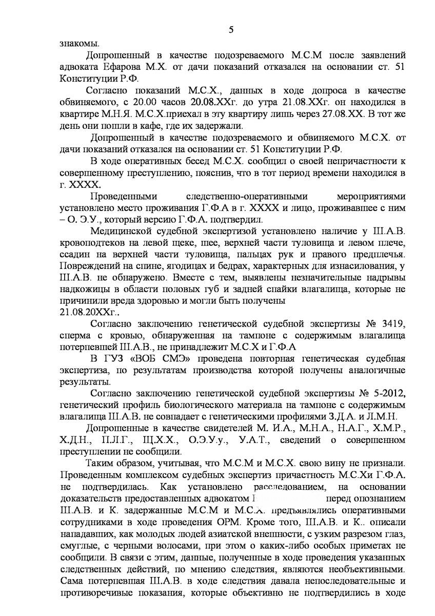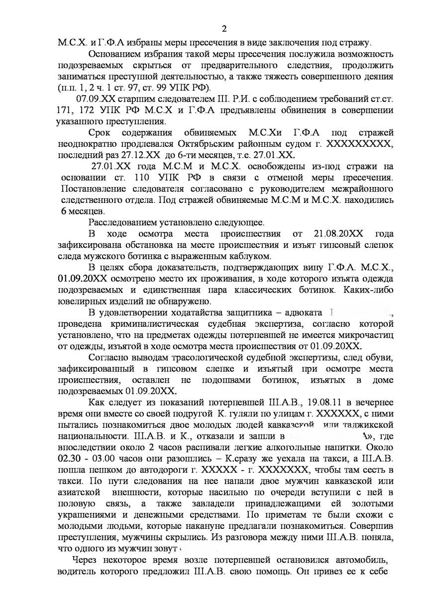 Адвокаты добился прекращения уголовного дела на стадии предварительного расследования по реабилитирующим основаниям в отношении двух граждан иностранного государства обвиняемых органами предварительно следствия в совершении преступления предусмотренного п. «а» ч.2 ст.131 УК РФ (изнасилование совершенное группой лиц) и п."а" , п."г" ч.2 ст.161 УК РФ (грабёж), наказание за которое предусматривает лишение свободы от восьми до пятнадцати лет, то есть преступление, которое в соответствии с ч.5 ст.15 Уголовного Кодекса Российской Федерации отнесено к категории особо тяжких преступлений.